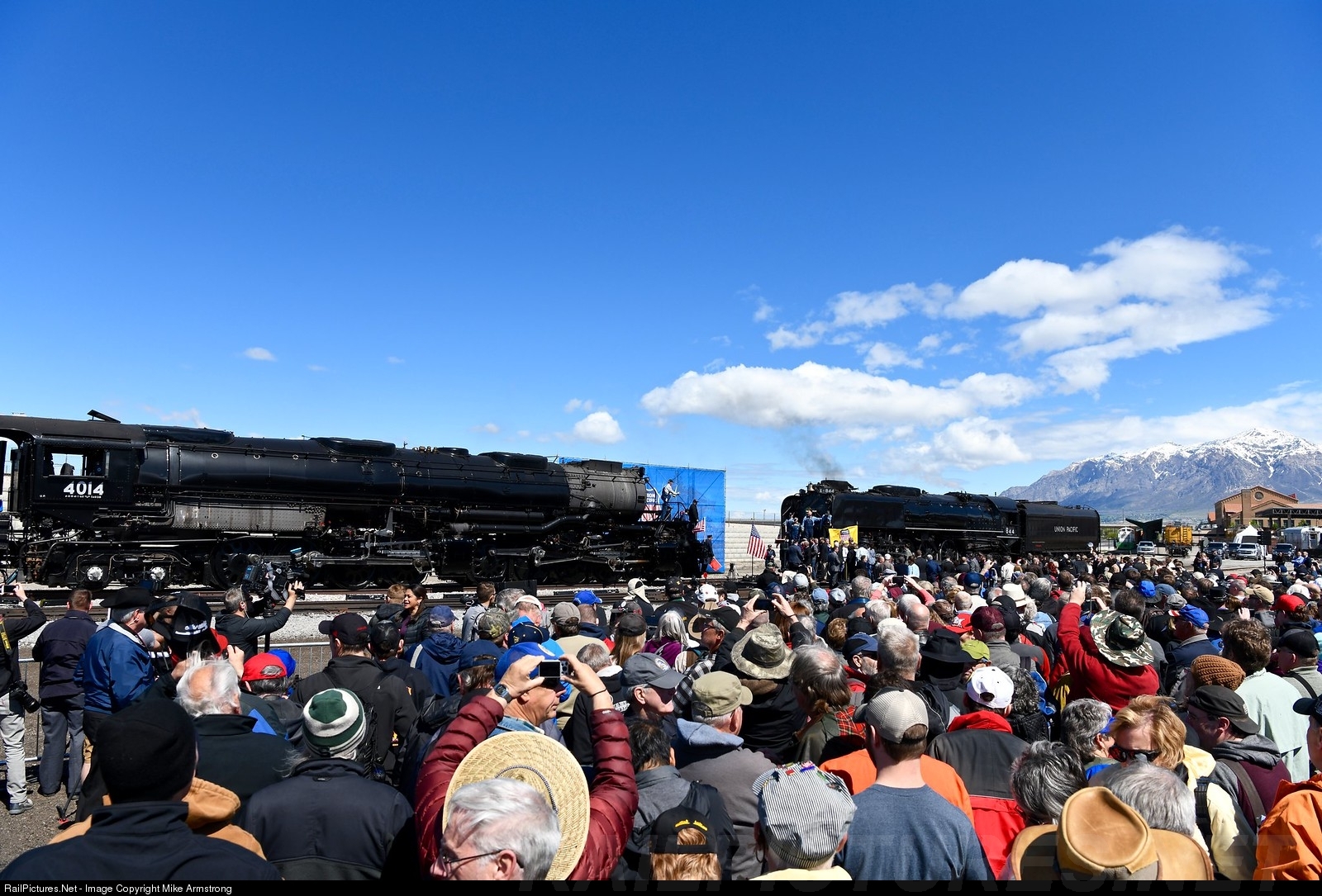 DONE!: With this word, the Transcontinental Railroad was declared completed on May 10th, 1869. One day short of 150 years later, the Union Pacific Railroad held a ceremony in Ogden, Utah to commemorate the anniversary of the occasion. Large crowds from all over the world gathered to see the UP 844 and 4014 posed nose to nose, mimicking that famous scene with the much smaller Central Pacific Jupiter and Union Pacific 119.