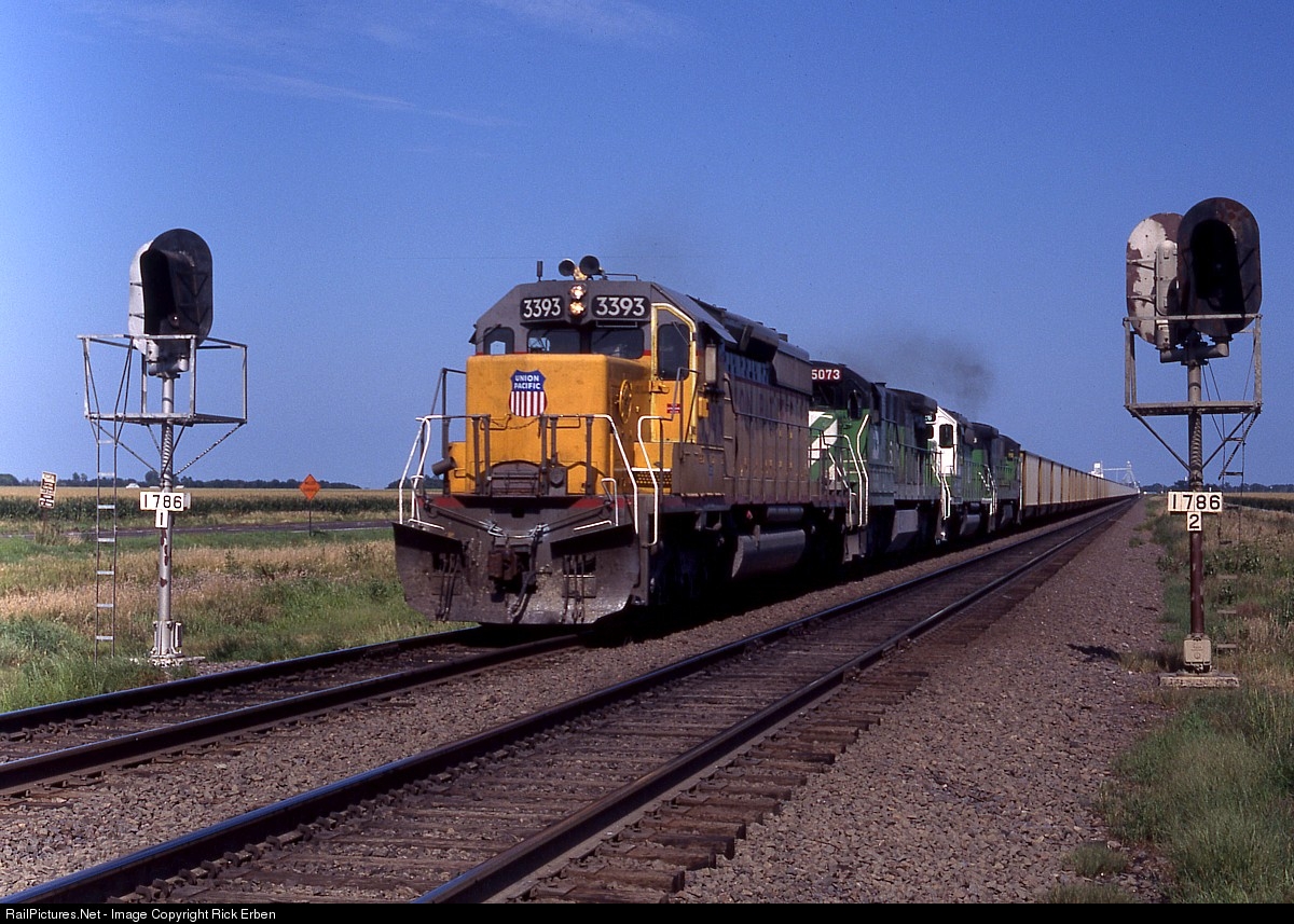 Coal trains for the Jeffrey, KS power plant, accessed off UP's Marysville Sub at Aikins, ran with pooled UP and BN power, as they were interchanged to/from BN at Northport, NE. Here westbound "Juke" empties are rolling out the rustic two-track mainline before the addition of a third main a few years hence. The two main tracks were handling perhaps 110 or more daily trains and the railroad could turn into dogcatch alley mighty quick if something got delayed.