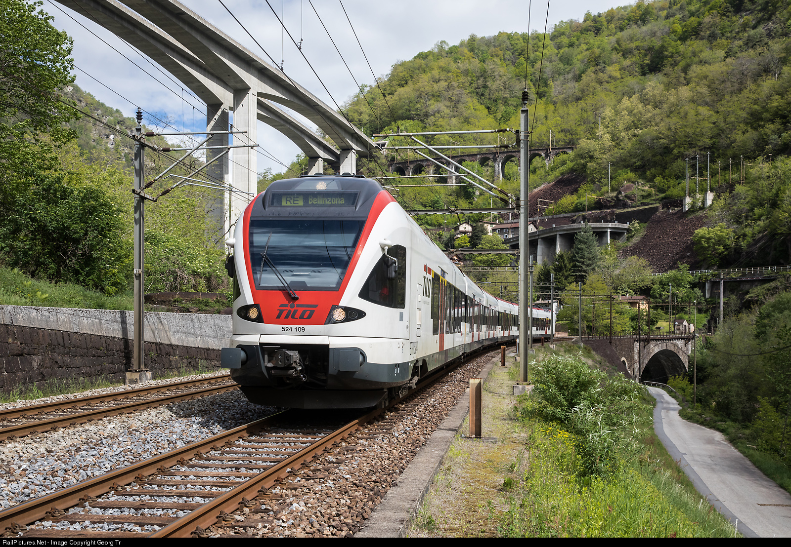 | Flirt RABe 524 # 109 of SBB daughter TILO is running the Regio Express 4319 from Erstfeld over the Gotthard mountain line to Bellinzona through the "staircase" of the Biaschina between Lavorgo and Giornico. On the uppermost level is the Pianotondo viaduct, followed by the two spiral tunnels Pianotondo and Travi. The impressive Biaschina viaduct of the motorway A2 is 100 meter high, 645 meter long with a main span of 160 meter and was built from 1979 to 1983. |