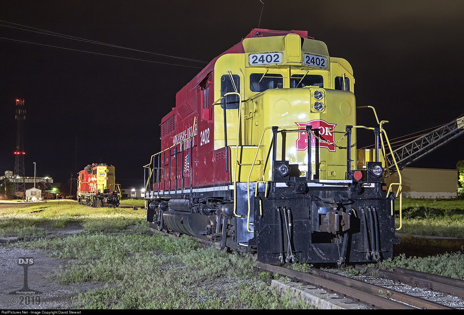 The stylish lines of EMD's GP30 series still thrives in a few places, one of these is on the Arkansas-Oklahoma Railroad. A pair of the carrier's "GP30s" with 645 power assemblies added and their Rock Island themed attire, former ATSF/BNSF units stands during the night of May 9, 2019 at Shawnee, Oklahoma.