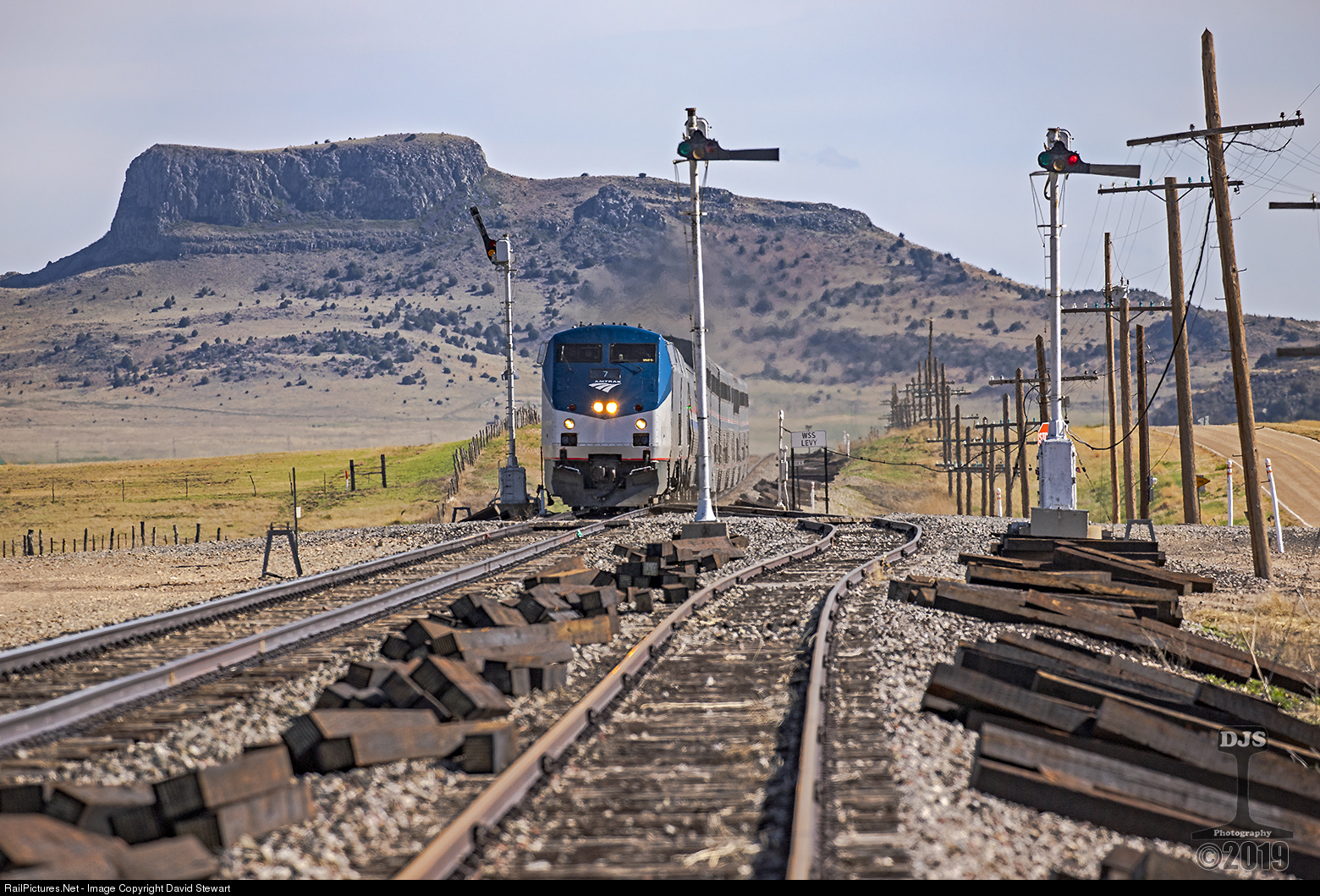 | Southwest Chief, train No4 heading for Raton is at track speed as it slams the west end of Levy, New Mexico on May 2, 2019. |