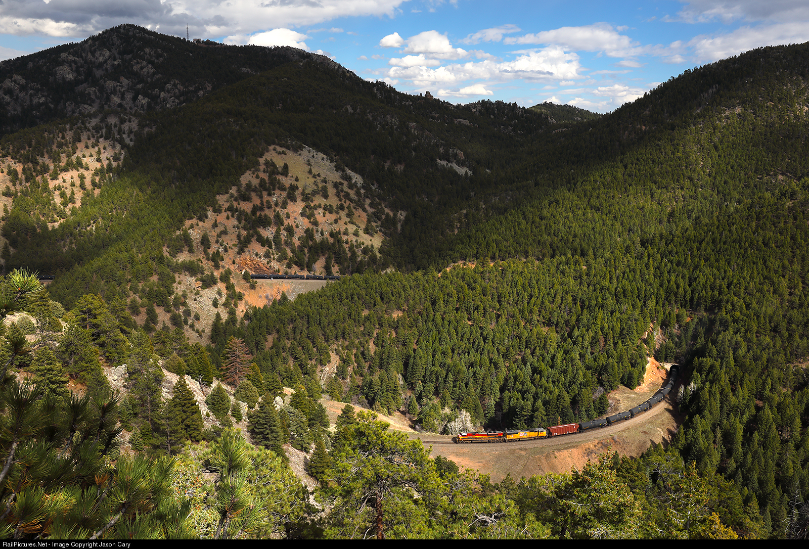 This area is known as South Draw deep in Tunnel District of Rio Grande's Moffat Road. The natural horseshoe of South Draw is used by the railroad to gain elevation on the climb to the Continental Divide. A Kansas City Southern SD70ACE and a Union Pacific SD70M lead a BNSF empty oil train out of Tunnel 16 on a 10 degree curve. The cars in the background are on a steep 2% grade passing thru Tunnel 15.