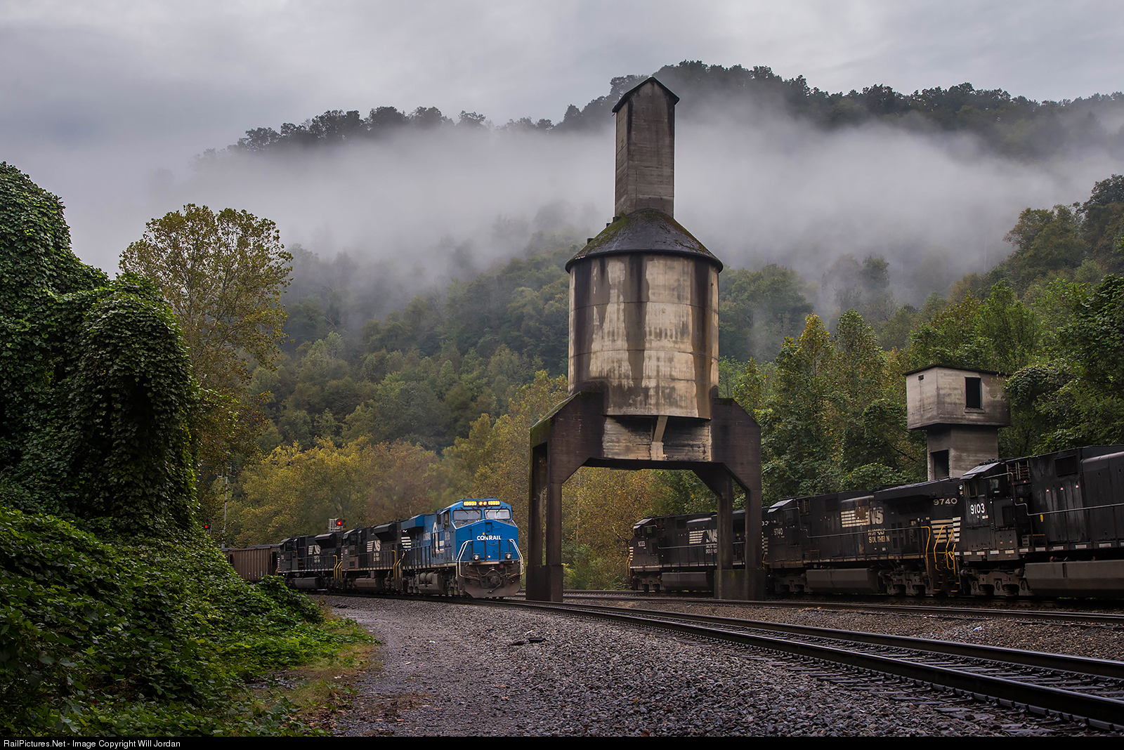 The Conrail heritage unit pushes coal loads past the ancient N&W coaling tower at Farm while several GE's idle away and fog rolls through the West Virginia hollers.