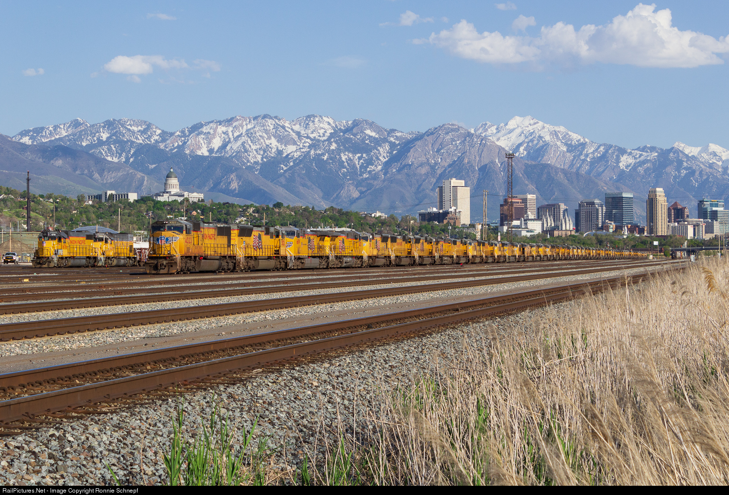 Beneath the looming skyline of Salt Lake City, a seemingly endless line of locomotives sits stored in North Yard.