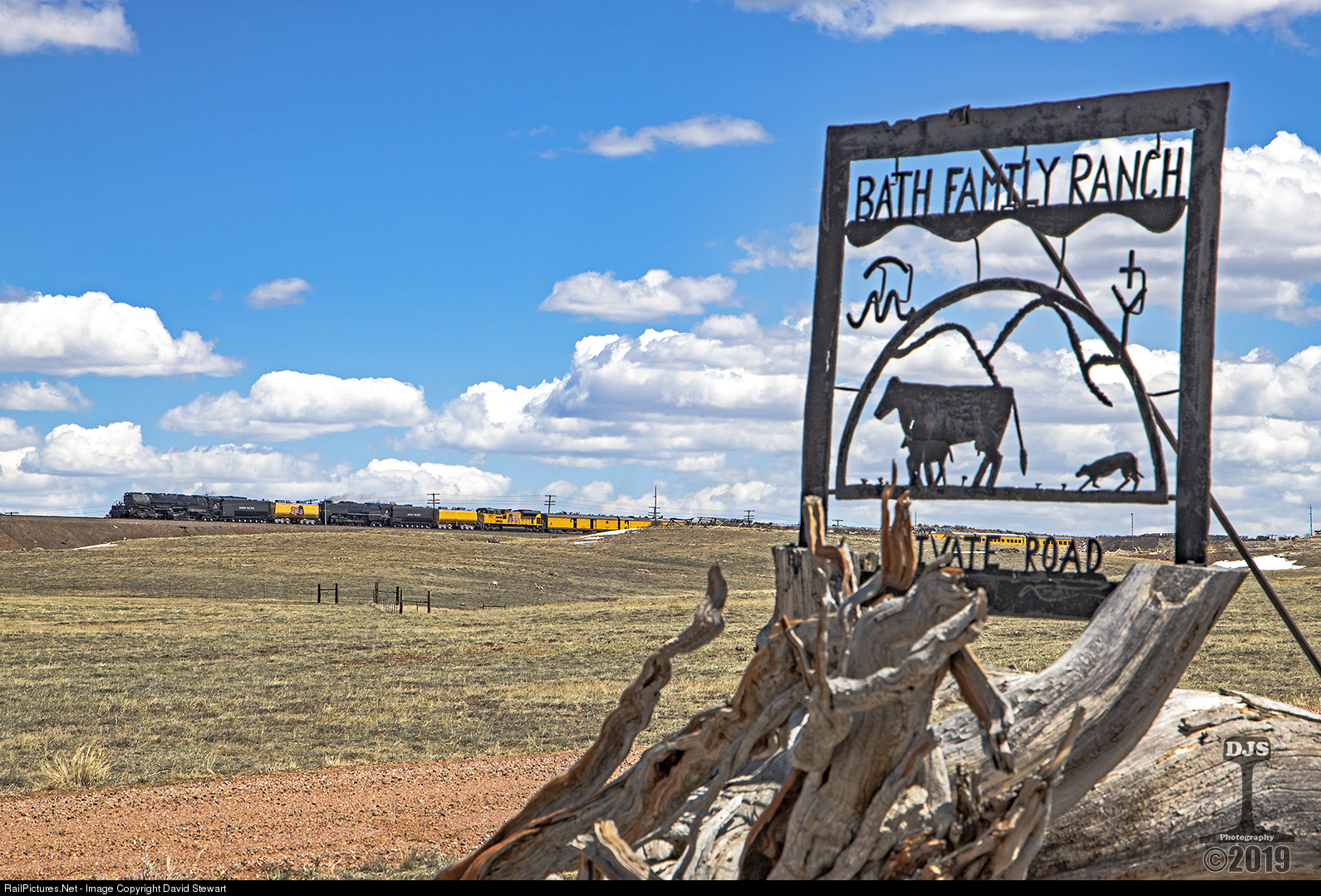 Big Boy, U.P. NÂș4014 polishes the rails of the Overland Route with the Great Race To Ogden as the train descends the western slope of Sherman Hill and along side Bath Family Ranch at Tie Siding, Wyoming on the much anticipated date by many spectators of May 4, 2019.