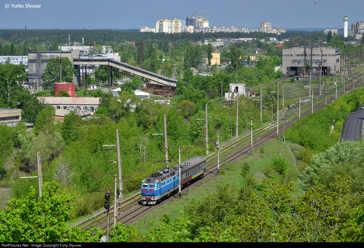 View from mount Divytch Hora in Trypillya towards the Trypillya-Dniprovs'ke station. On this picture can see as electric locomotive CHS4-117 goes southward with car-defectoscope