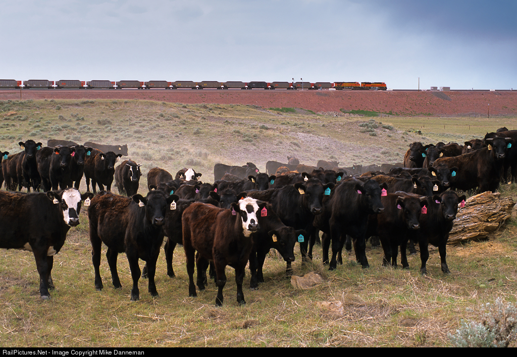 A heard of cattle is definitely more interested in the photographer than the northbound BNSF coal train passing by in the background through Belle Ayr Junction, Wyoming, on May 30, 2009.