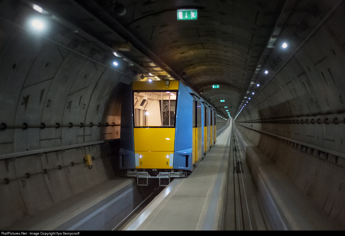 The 2 km cable-driven peoplemover links the newly opened Terminal B with terminals D, E and F on an underground alignment. Services are operated with two four-car trainsets. Each has a capacity of 108 passengers, giving the line a design capacity of 1 676 passengers/h per direction. The trains run at 47 km/h, giving an end-to-end journey time of 3¼ min.