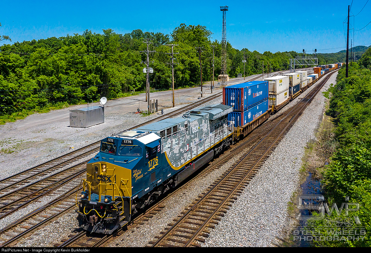 CSX Transportation's Spirit of the Armed Forces specially-painted ES44AC 1776 is preparing a setout of intermodal cars for Charlotte, NC, off of the Chicago, IL to Chambersburg, PA intermodal train Q01623 at Cumberland, MD.