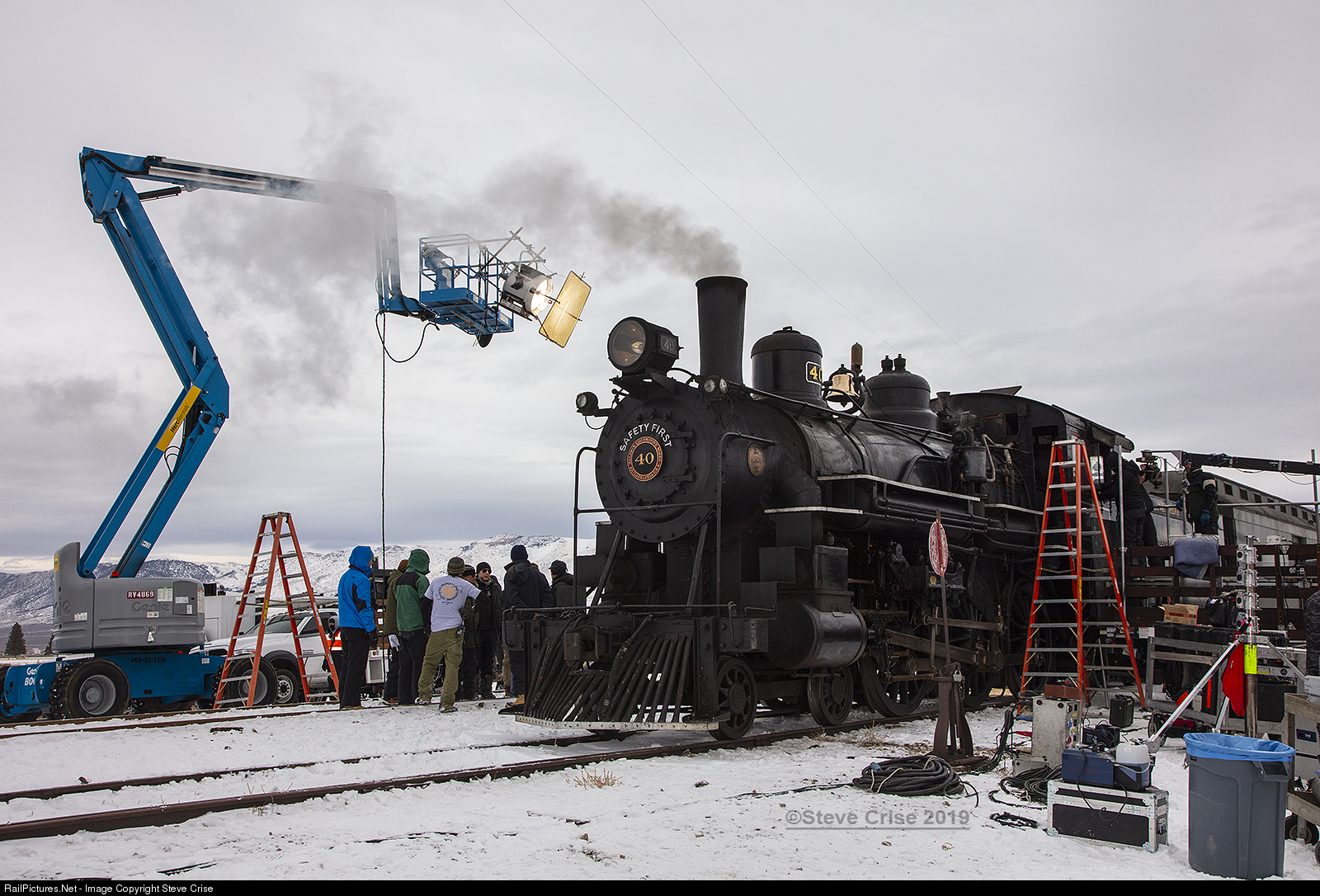 | Lights, Camera, Action - STEAM! One of the co-stars of the latest AT&T commercial is none other than the 119 year old movie star herself, Locomotive # 40 of the Nevada Northern Railway. She takes center stage as both a real performer on the high iron and as an animated caricature of herself along with her intrepid charge of freight cars. The segment was shot last February over a several day period on various portions of the NNRY. To view locomotive 40 in action, please visit: https://m.youtube.com/watch?v=02g5bQ2Egmg. ©Steve Crise 2019 (File SJC_NNRY_029493) |