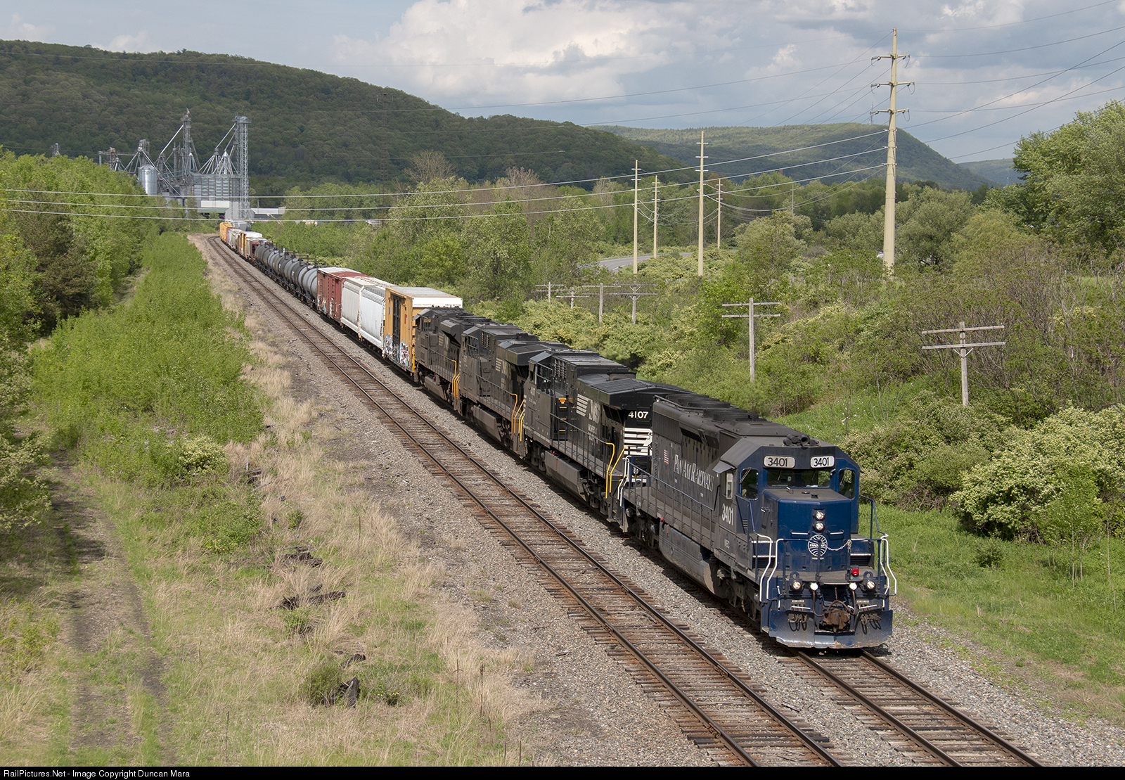 | NS trains off of Pan Am Southern will sometimes get Pan Am 3400 series EMDs as add-ons and continue south onto NS territory, as was the case here on this 11R. Pan Am SD40-2 #3401 leads four other NS units south towards Binghamton on the D&H past the former site of the yard at Oneonta. |