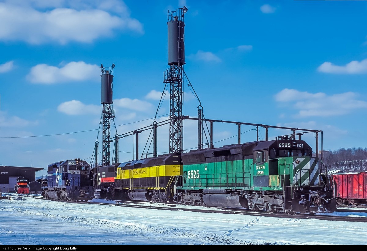 Susquehanna power is visiting Delaware & Hudson’s East Binghamton engine terminal in this January 1988 view. In about five months, the D&H will declare bankruptcy, and the NYS&W will be directed to operate the Bridge Line. The other three locos in this view, one each from Mine Central, Boston & Maine, and Springfield Terminal, will become scarce in these parts.