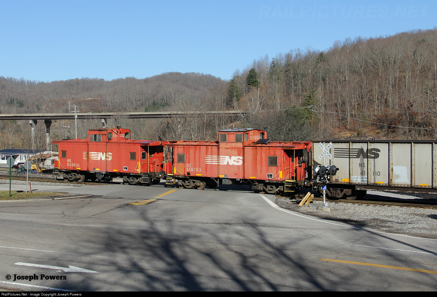Norfolk Southern mine run U44 heads east out of the yard at Norton, Virginia with two cabooses on the end of the train. The empty coal train will make a reverse movement onto the Big Toms Creek Branch at Coeburn, Virginia to be flood loaded. Although it is typical of an empty coal train out of Norton to have a caboose as a shoving platform for reverse movements on the Big Toms Creek Branch, it is unknown to the photographer as to why two cabooses were used on this day.