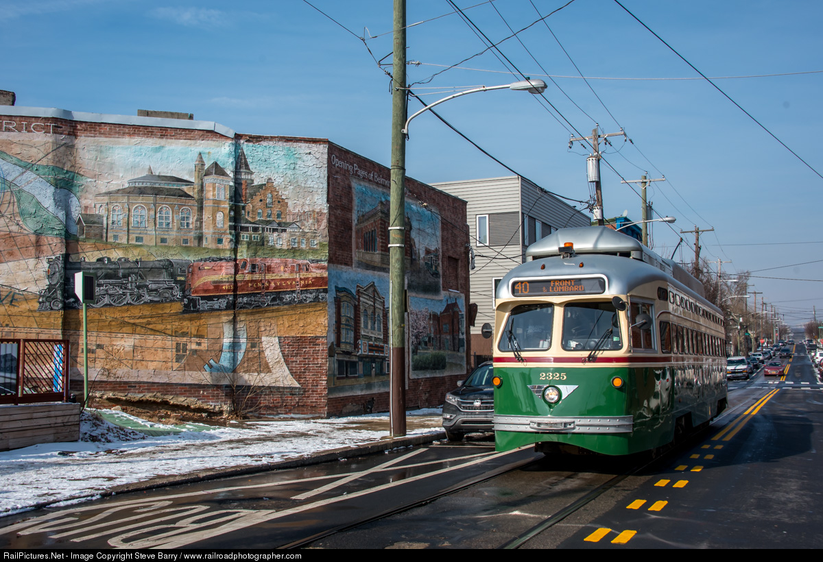 | A SEPTA PCC-2 pauses next to a mural depicting a Pennsylvania Railroad K4 steam locomotive and GG1 electric locomotive. This was a photo stop on Super Saturday Streetcar Special XXVI sponsored by the Wilmington Chapter NRHS. |