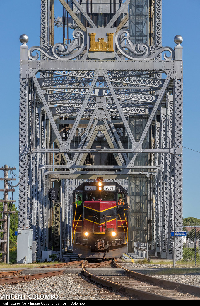 Mass Coastal 2009 (ex-IC GP28) leads the southbound Energy Train over the 544' long vertical-lift bridge over the Cape Cod Canal.