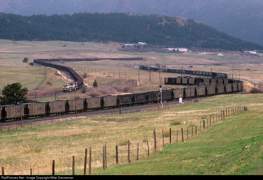Two trains meet near Palmer Lake, Colorado, at a location know as “Sag” or Spruce. When the Santa Fe built its line between Colorado Springs and Denver, Rio Grande was already there, and per agreements, had to utilize several flyovers. One of these is seen here between the trains. In 1918, Colorado and Southern (later, Burlington Northern)/Santa Fe and Rio Grande began a joint operating agreement and the Joint Line was born. The tracks were realigned and crossovers were eliminated to simplify operations. But the 1974 removal of the Santa Fe route through Colorado Springs created a single-track bottleneck between Palmer Lake and Crews. In this photo on the right, a southbound Union Pacific coal train waits at the approach signal for single track at Palmer Lake, and is meeting a northbound Burlington Northern Santa Fe coal empty led by a pair of BNSF Grinstein-painted EMD SD70MACs.