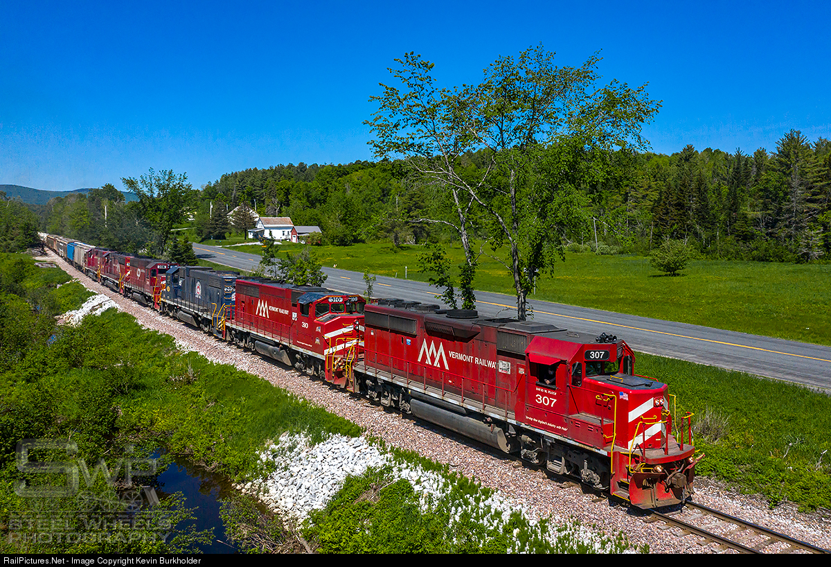 Vermont Rail System's Saturday slurry (and salt) train 263-08 required a 6-unit consist to move 63-cars and 8,190 tons up the nearly 2% grade from Rutland to the summit of the Green Mountains at Mt. Holly on June 8. The train is seen climbing the steepest part of the grade at Mt. Holly with an all-VRS family consist that includes VTR GP40-2 307, GP40-2L 310, VTR GP38-2 202 (Washington County paint), CLP GP40-2 306, VTR GP40-2 308 and CLP GP38-2 204.