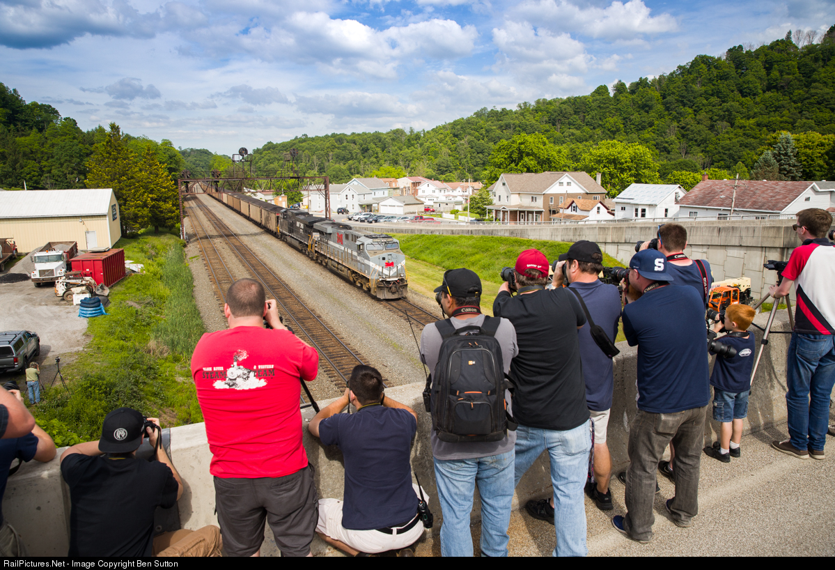 Railfans from all around line up to take their shot of the MGA heritage unit in DPU service on a loaded 776 ducking under the signals at PT 263 on the NS Pittsburgh Line which were recently torched from this location.