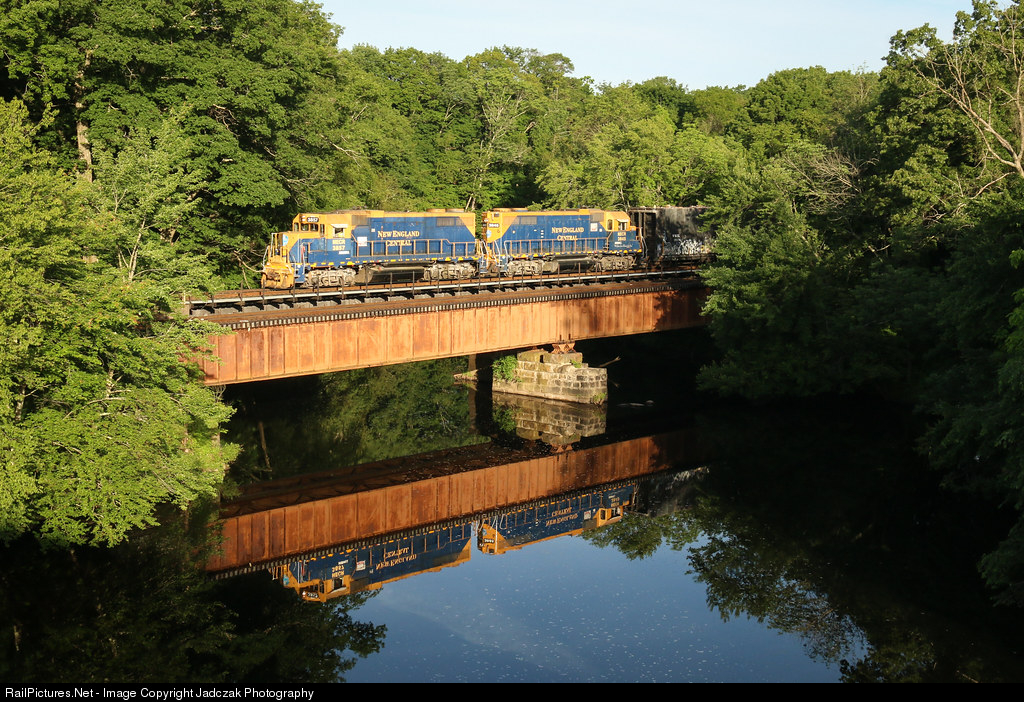 NECR 608 heads south over the Willimantic River in good light with good power.