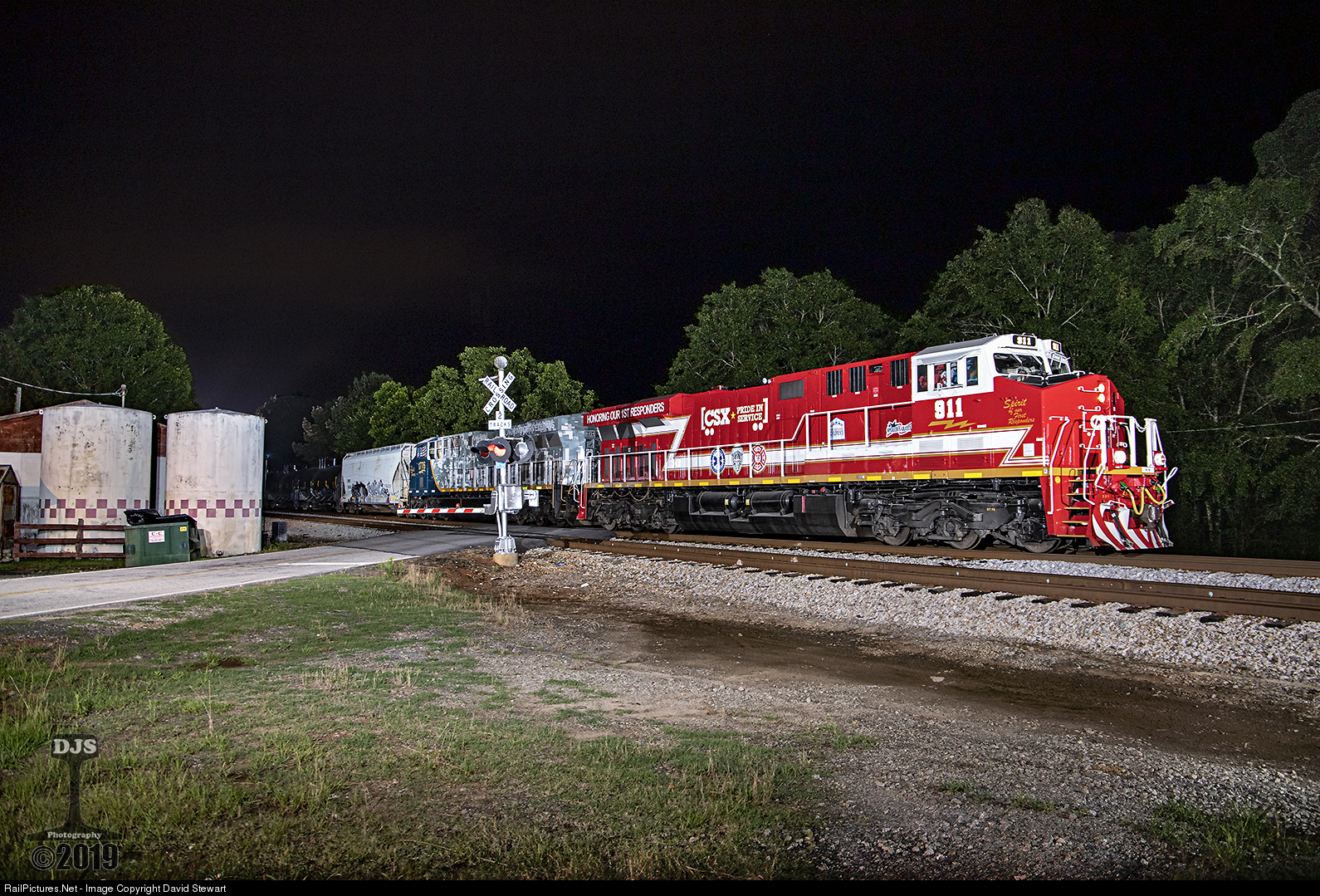 | CSXT's pair of specially dedicated units honoring First Responders and U.S. Service Veterans leads K423 through Haralson, Georgia on the Manchester Subdivision in the early hours of June 13, 2019. |