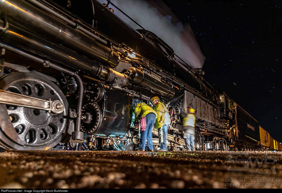 On May 2, 2019, the Union Pacific Railroad's Big Boy 4-8-8-4 #4014 made a test run from Cheyenne, Wyoming to Nunn, Colorado, before turning back due to time constraints for the steam crew. As the train arrived Nunn, it took the siding to allow for the passage of two trains that were following the test run south on the Greeley Subdivision. Whilst in the siding, the steam crew took the opportunity to look everything over and perform any servicing necessary on the brand new parts. The crew is seen doing just that at nearly midnight on May 2. Additional prints are located: http://www.steelwheelsphotography.com/bigboy/