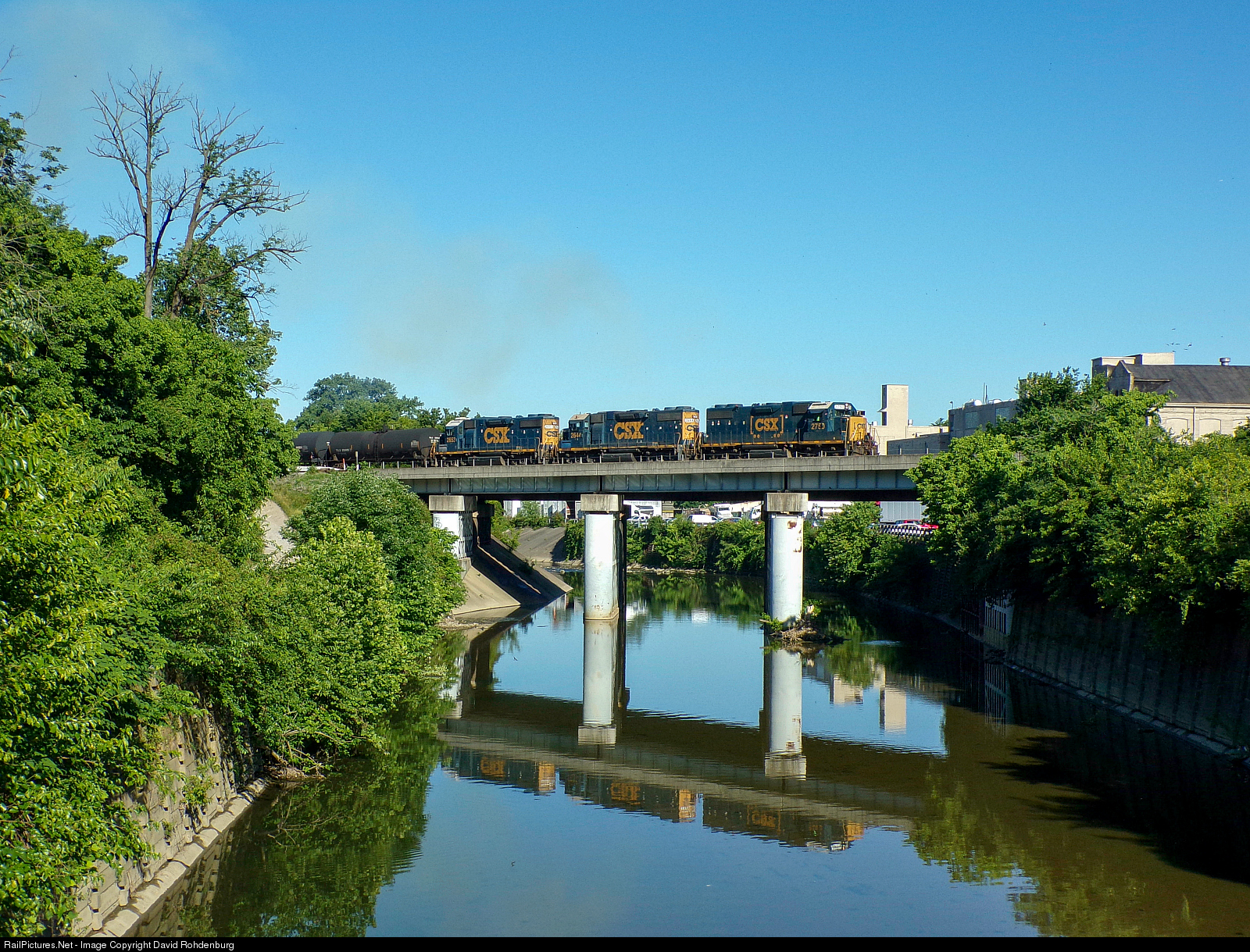 | With their EMD 16-645E's in full song, three classic CSX GP38-2's power road turn job J784-14 across the Mill Creek Bridge at Winton Place Interlocking in the Cincinnati suburb of Spring Grove Village, Ohio, on an absolutely beautiful late Spring morning. |