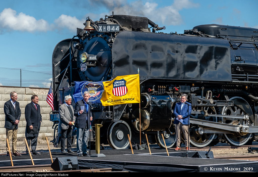 Union Pacific - Building America! With "Living Legend" 844 as a backdrop, and flanked by local dignitaries and senior UP Management, UP Chairman and President Lance M. Fritz addresses a crowd of several thousand, assembled in the yard adjacent to Ogden's Union Station on the eve of the 150th anniversary of the Transcontinental Railroad. On May 9th, 2019, UP staged a sort of Golden Spike re-enactment of their own in downtown Ogden, the closest remaining UP terminal to Promontory Summit. Playing the roles of the Jupiter and the 119 this day were Big Boy #4014 and Northern #844, which faced each other nose-to-nose in the final ceremony. I listened to Chairman Fritz' remarks on this day in Ogden, and the next day up at Promontory, and I thought he did an excellent job, not only representing his company, but also in putting some perspective on the importance of both the original event, and the celebration of the sesquicentennial. It's not often that corporate brass addresses public gatherings this large, but the boss out-shined the politicians on this day, at least in my humble opinion. All-in-all, UP and its people put on a first-class show over the two-week period with the "Great Race to Ogden" and with the ceremonies marking the 150th anniversary of the Golden Spike.