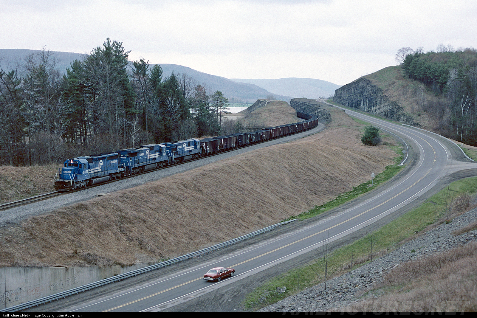 The head end of this northbound train has passed through the rock cut at the north end of Hammond Lake, and is about to cross the overpass over PA Rt. 287. In less than 6 months, the approximate 65 miles of the former NYC line south of here from Wellsboro Junction to Jersey Shore, PA, the track through "the Grand Canyon of Pennsylvania" and down through Pine Creek Valley would be abandoned and be dismantled by mid-1989. Service through this area from Wellsboro, PA to Corning, NY is now provided by Wellsboro & Corning Railroad (WCOR). Passenger excursion service through this scenic area is provided by the Tioga Central Railroad.