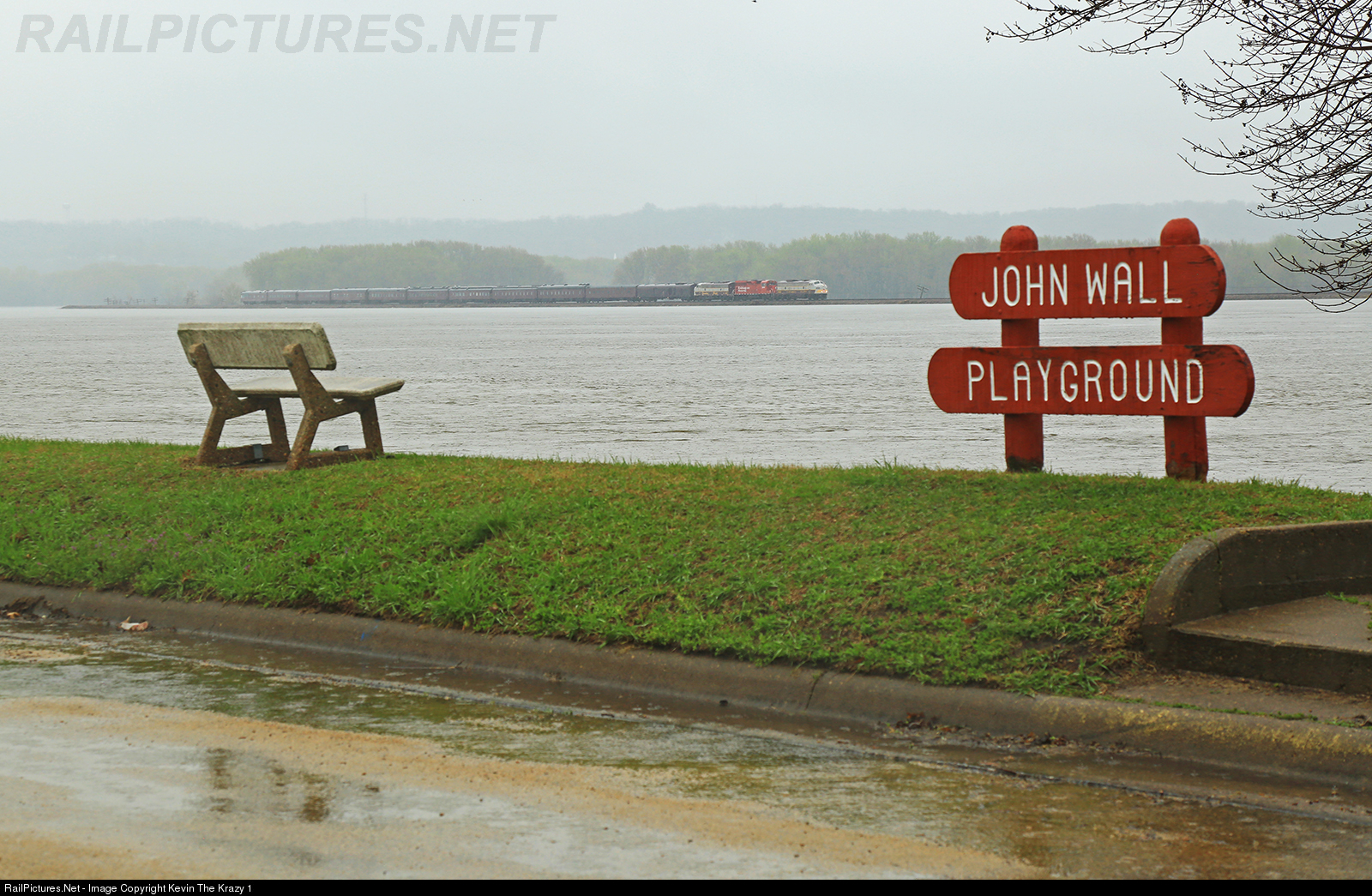 CP 1401 makes its way down the causeway between the Mighty Mississippi and Edick Lake seen from the flooded playground at Sabula, IA.