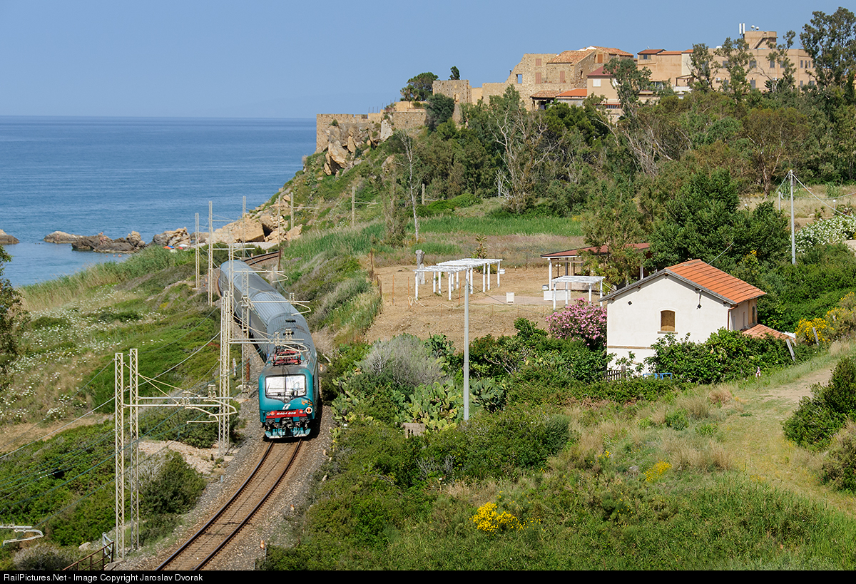 | Passenger train from Messina to Palermo, headed by locomotive E 464 086, is captured as it travels through the beautiful landscape along the sea in Castel di Tusa. |