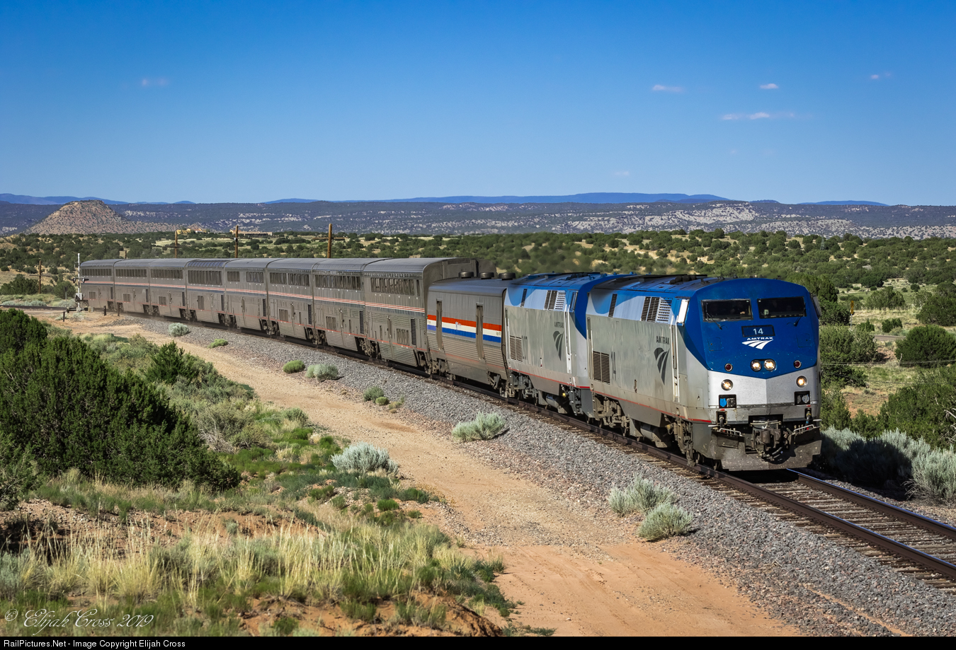 | It's a beautifully hot first day of Summer, and featured here we see Amtrak's Southwest Chief making its daily appearance in the picturesque community of Galisteo, NM as it traverses the high-desert terrain of Northern New Mexico. |