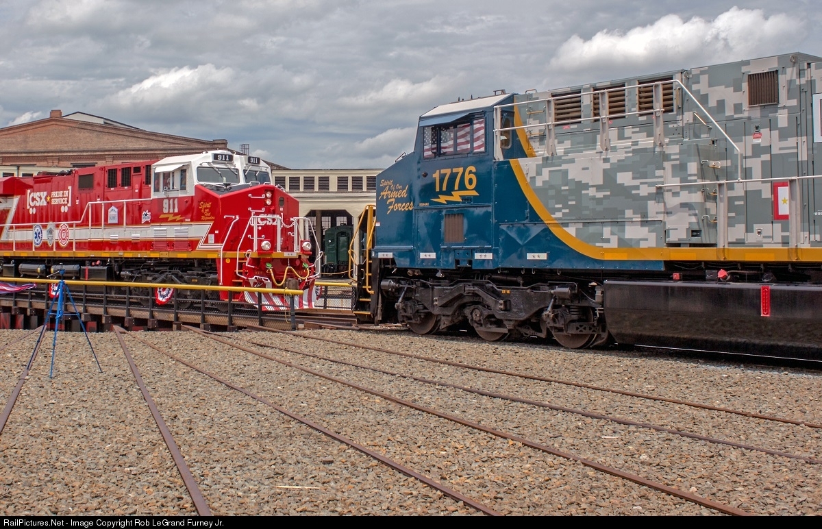 CSX 911 and 1776 meet nose to nose as storm clouds build over the Bob Julian Roundhouse. Was a real treat to see these along with NS 911 at the historic Spencer Shops.
