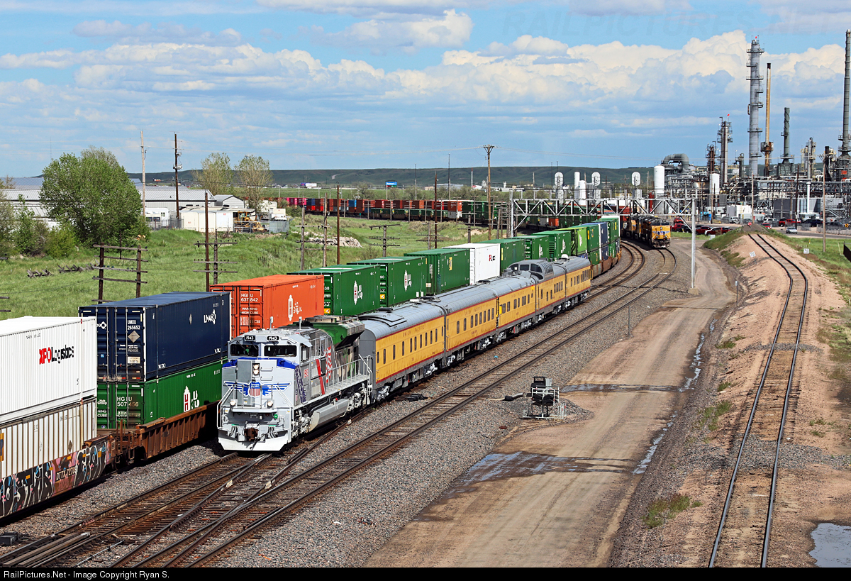 | Having split a pair of 'I' trains at the east end of Cheyenne Union Pacific's Military 'Spirit' painted 1943 sails through the OS at W508 with a 5 car westbound special. |