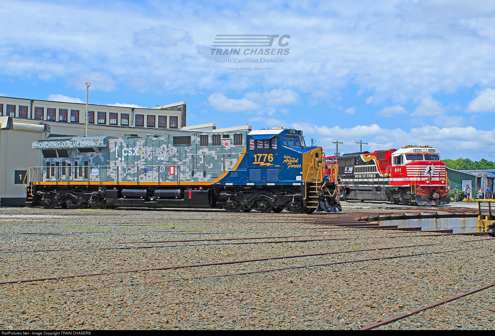 CSXT #1776 ( Honoring Our Veterans ) unit sits at the Spencer Round House for display with NS #9-1-1 ( Honoring First Responders ) along the side.