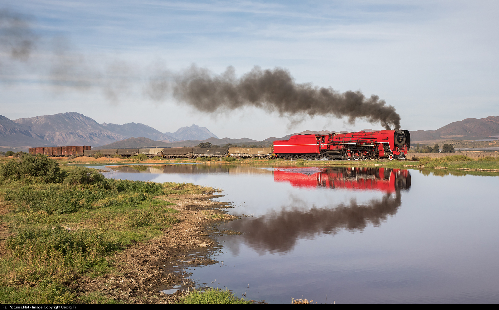 The unique 4-8-4 class 26 # 3450 "Red Devil" (Transnet National Collection) is leased by the Ceres Rail Company and made operational again since last year. The world most powerful "narrow gauge" (Cape gauge 1067 mm or 3 ft 6 in) steamlocomotive is pulling a 13 cars freight train for the FarRailTours journey, along a pond between Asthon and Klaas Voogdsrivier, on the former Cape Central Railway line. The locomotive was built in 1953 as class 25NC by Henschel/Germany for the South African Railway (SAR). In 1981 it was heavy rebuilt by mechanical engineer David Wardale from England while in the employ of the South African Railways. The rebuilding took place at the Salt River Works in Cape Town and was based on the principles developed by Argentinian mechanical engineer L.D. Porta. Using both mechanical and electronic indicating equipment, the Class 26 # 3450 recorded 4,492 indicated horsepower (3,350 kilowatts) on tests between Pretoria and Witbank, a world record for a narrow gauge locomotive. According to the dynamometer car, this was then developing 3,787 equivalent drawbar horsepower.