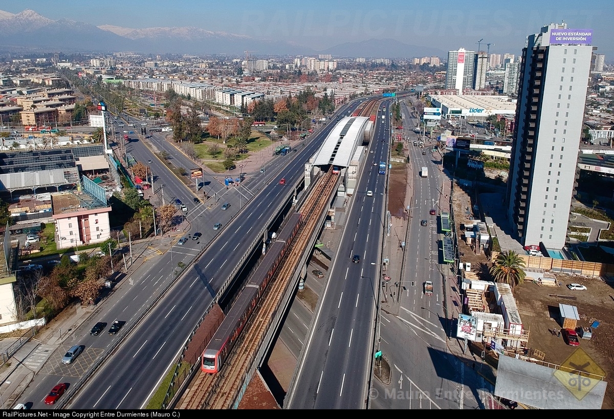 | Passenger service of Metropolitan Railroad at Santiago, circulating by L4 line parallel to the Americo Vespucio Highway and over Departamental and Macul avenue, in direction Tobalaba terminal station, in Providencia. |