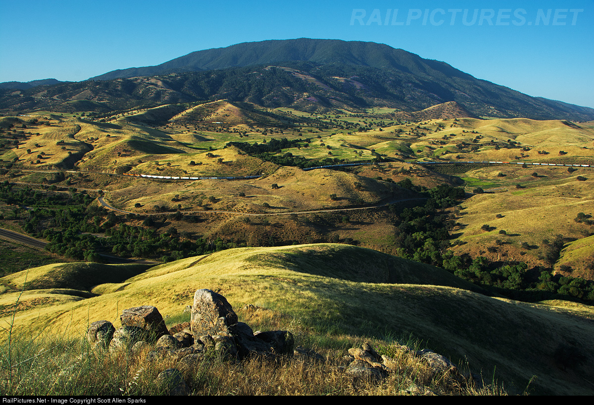 In the early glinting hours of a perfect late spring morning in the lower Tehachapi hills, a north bound BNSF intermodal slowly drifts off the grade, through tunnel 1 and down into the Caliente valley, as the warm sun hits the train’s sides along the way. Seen pushing it’s rear portion up into Bealville, are the DPUs of a south bound UP manifest, that was holding in Bealville for the intermodal to pass by.