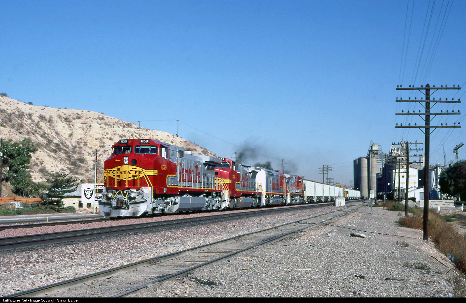 659 leads an ATSF train through Victorville, passing the CEMEX cement plant.