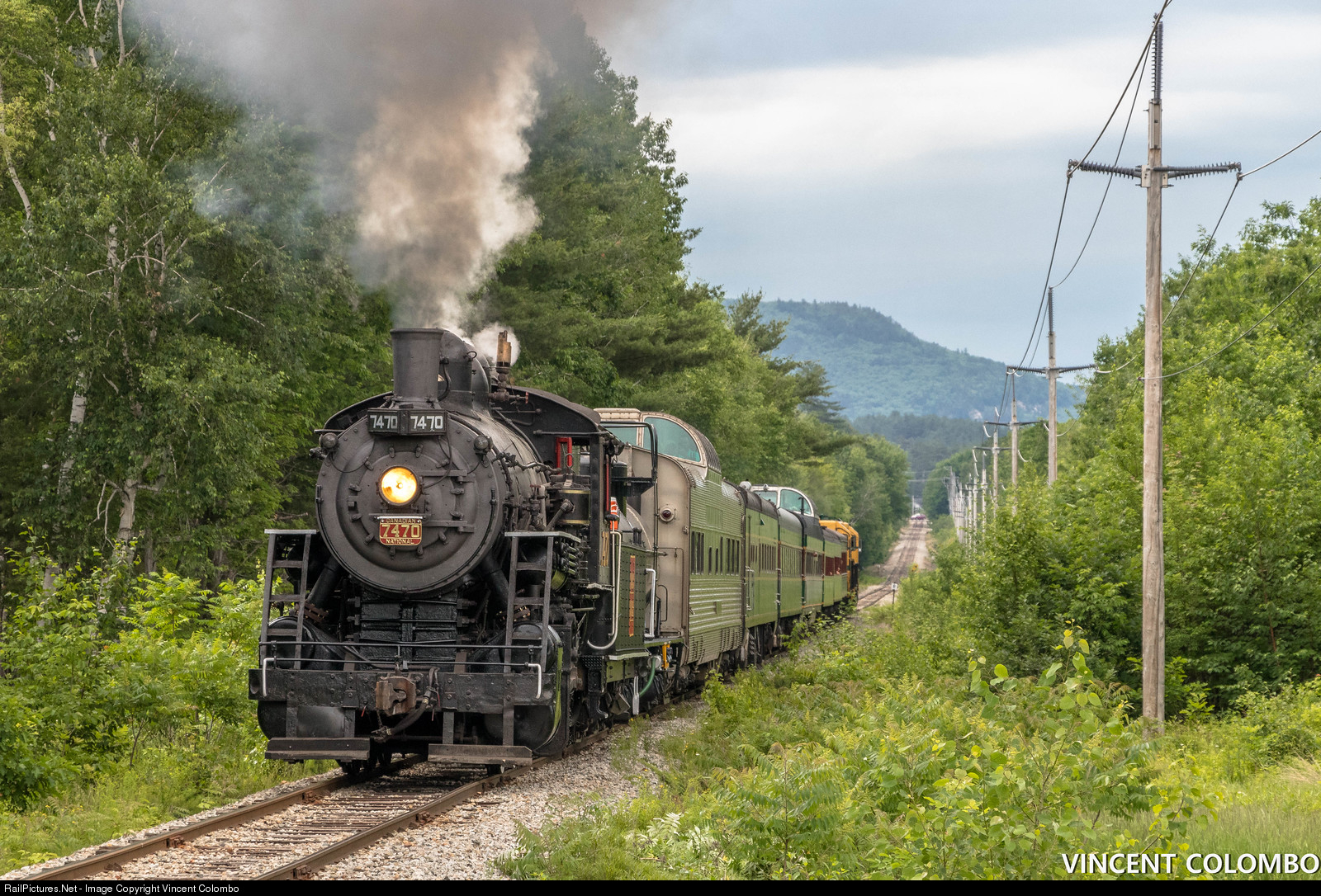 | Conway Scenic 7470 (ex-CN 0-6-0) leads a special on the former Maine Central Mountain Division at Drew Road in Intervale, NH. The special is running from North Conway to an airshow in Hazens and return. 7470 is back running after a 4.5 year absence from service due to a boiler inspection |