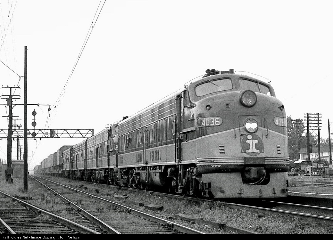 In the late 1960s the Illinois Central operated an expedited overnight piggyback service between Chicago and Memphis, trains 50 and 51, known as the Fastback. E-units were the regular power. At dusk, a quartet of E-units led by E9 4036 hustle the southbound Fastback through Homewood, IL, bound for a scheduled 7 AM arrival in Memphis.