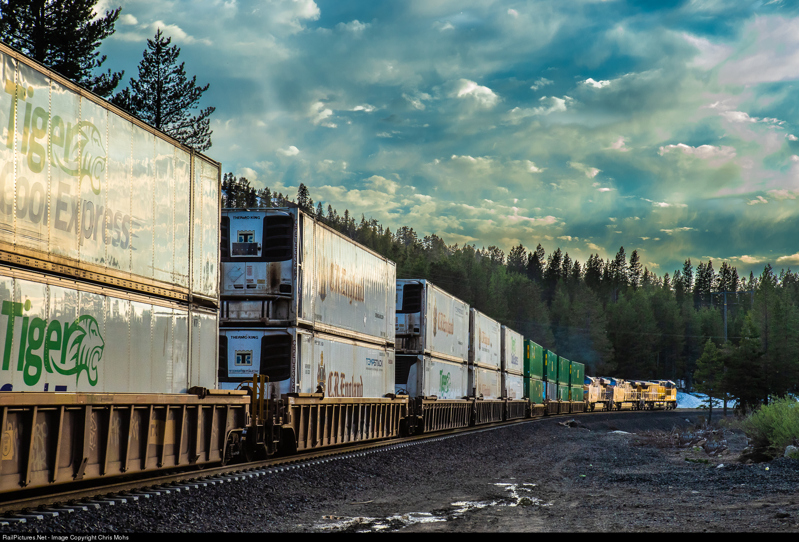 Sliding westbound down the western flank of the Sierra Nevada, Union Pacific No.7091 leads stacks into the setting sun.