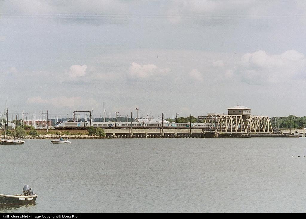 An Acela Express crosses the Mystic River swing bridge.