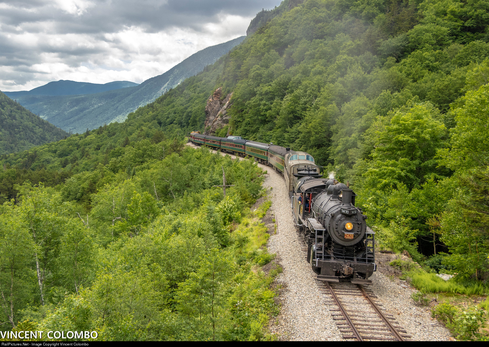 After being out of service for over 4 years for a boiler inspection, Conway Scenic 7470 (ex-CN 0-6-0) is running once again in New Hampshire's White Mountains. To celebrate, Conway Scenic had 7470 lead a special through Crawford Notch to Hazens to the Hazens Airshow. Behind 7470 was a tank car full of water, the new Burlington "Silver Splendor" dome car, six Notch Train cars, 252, and 216. 7470 is seen here working hard and approaching the Gateway near Crawford Notch Station.