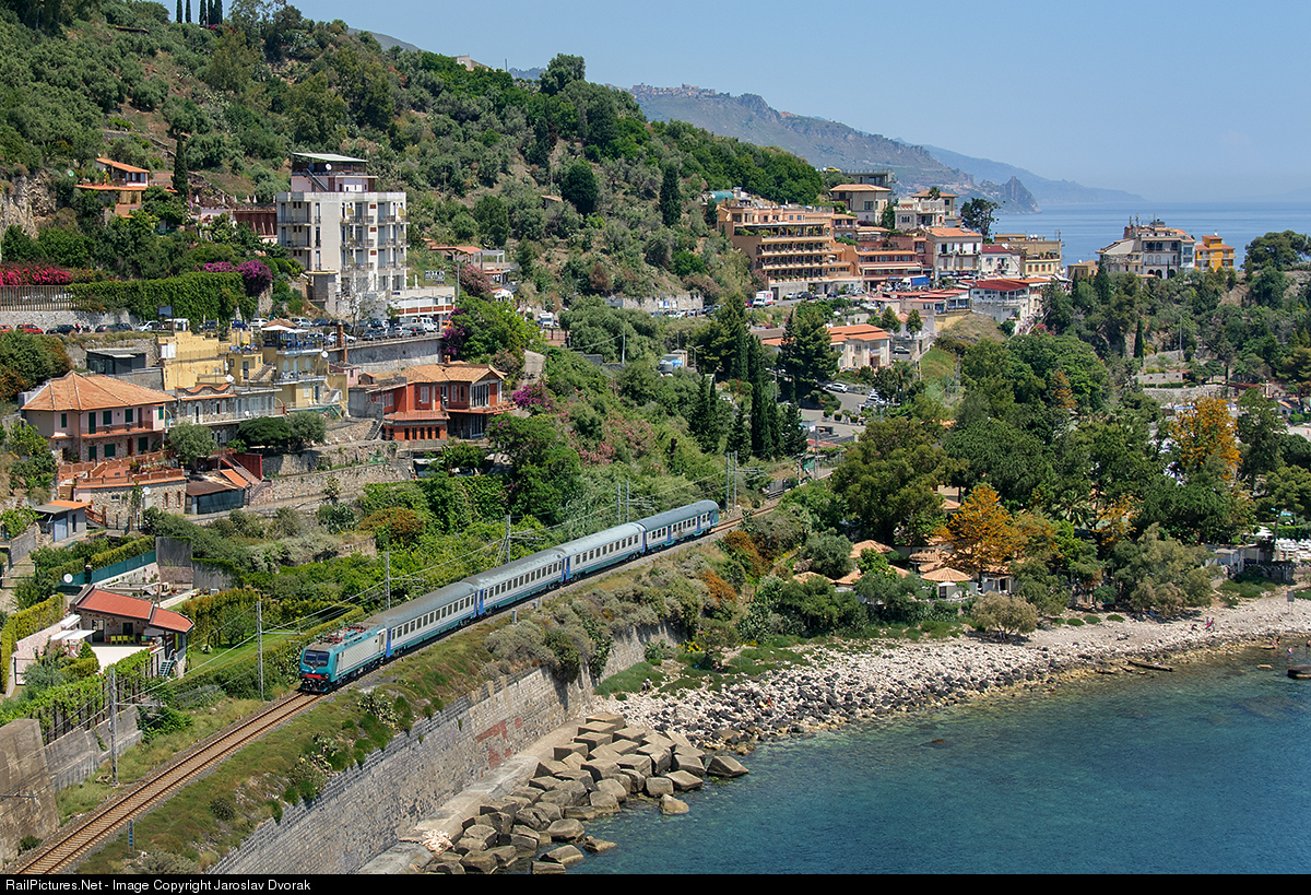 | Passenger train from Messina to Catania captured in Taormina, one of the main tourist centers in Sicily. The village is exceptional for its history, preserved monuments and location on the rock above the sea with a view of mainland Italy and Mount Etna. |
