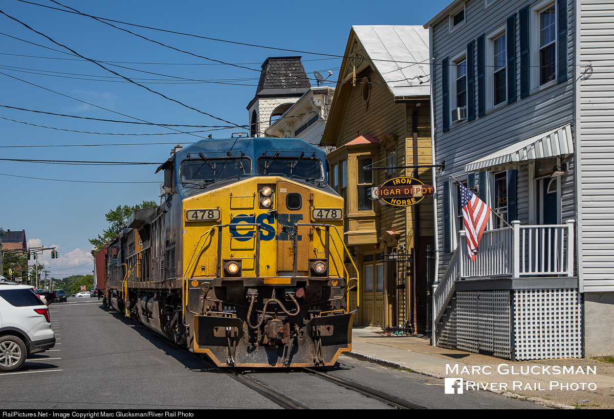 Hang out your flags for the Fourth! CSX B765-03 makes famous street running trip trip down South 7th Street in Hudson, NY on the afternoon of July 3, 2019. AC44CW 478 (YN2) is a new arrival on this route, having only recently had its plow cut for 3rd rail clearance on the lower portion of the Hudson Line as CSX seems to be phasing out its existing EMD units. The Iron Horse Cigar Depot loosely derives its name from the Iron Horse Tavern in “Nobody’s Fool” with Paul Newman, filmed on the other end of this street in a bar that had been named “State Grill”.