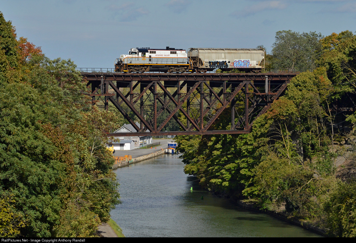 RS-32 2035 and a single car fly high over the Erie Canal in Lockport.