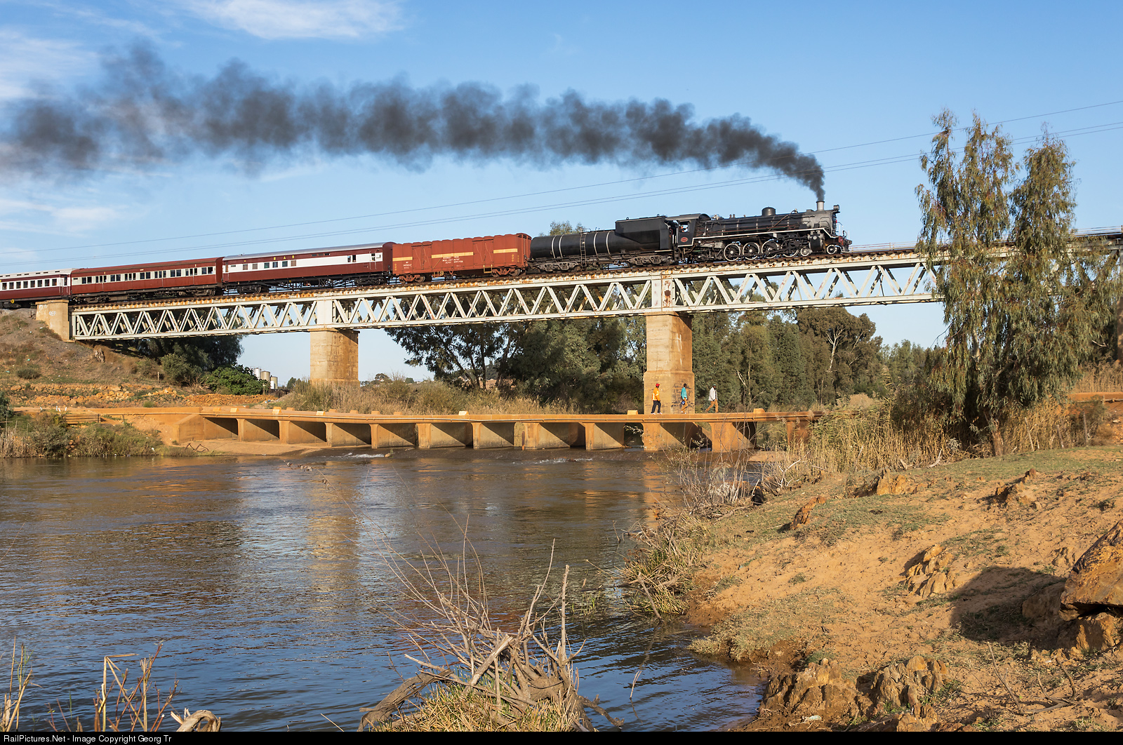 The oil fired 4-8-2 steamlocomotive 19D # 3322 of the Ceres Rail Company is crossing the Bergrivier on the truss bridge between Moravia and Koringsberg on the Klawer line with a photo charter train for FarRail Tours.