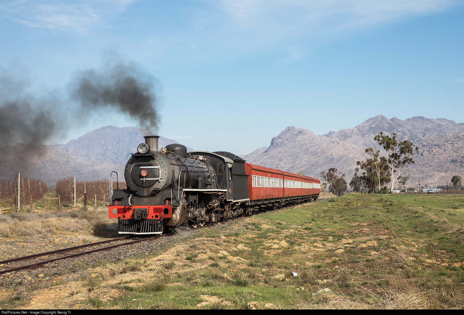 The former South African Railways (SAR) 4-8-2 19B # 1412 of the Ceres Rail Company is pulling a passenger train for FarRail Tours on the line between Demeter (Ceres) and Prince Alfred Hamlet. The locomotive was built in 1930 by the Berliner Maschinenbau AG (BMAG, former Schwartzkopff) and is owned now by the Ceres Rail Company of Derick du Toit.