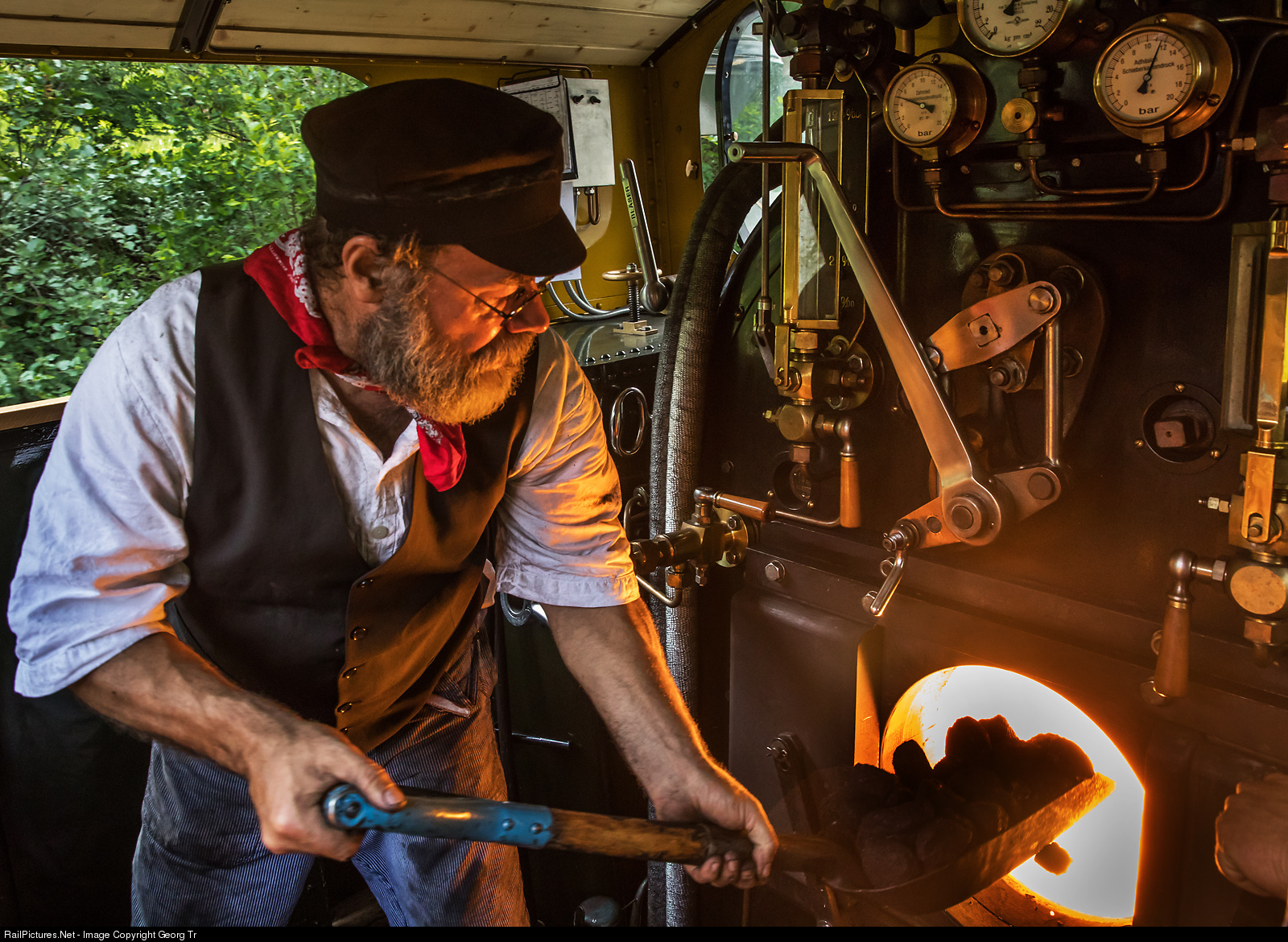 | On the footplate of Europe's most powerfull narrow gauge cogwheel steamlocomotive, HG 4/4 # 704 of the Dampfbahn Furka Bergstrecke (DFB), which is running up the mountain on a grade of 11.0 % with a steady 15 km/h. Fireman Bernhard is throwing another shovel of welsh coal into the firebox. This 0-8-0 T 800 horsepower 4 cylinder compound locomotive was built by the SLM Winterthur in 1923 and delivered to Indochine (later Vietnam), now is is operational on the Furka mountain line new this season. |