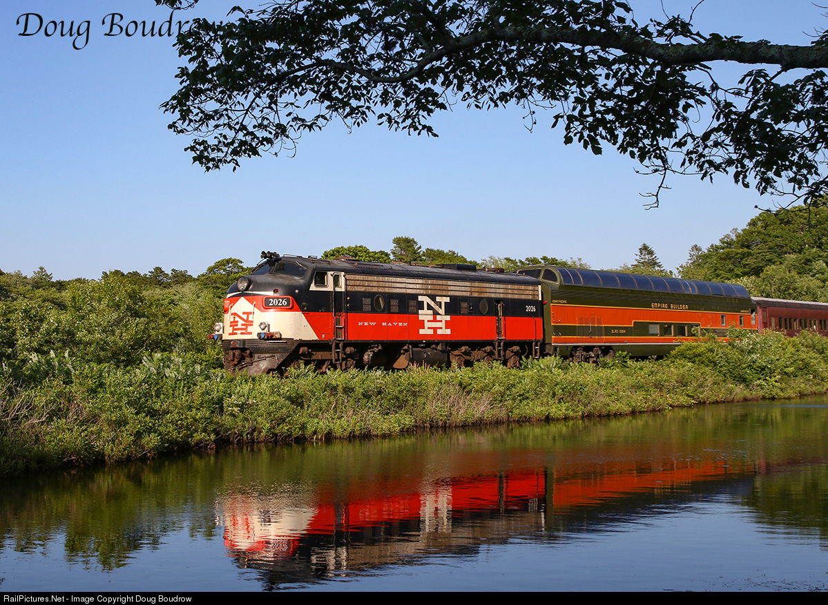 | The Dinner Train which departed Hyannis at 5:30 heads past Hoxie Pond in Sandwich. The FL9 locomotives that pull this train are in their as-delivered McInnis schemes and saw service on this very line during the New Haven era. |